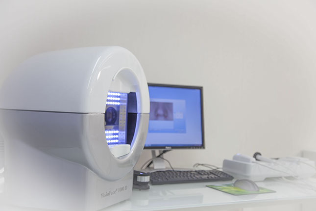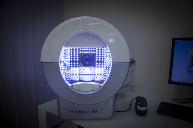 Appareil de haute technologie permettant, à l’aide de caméra et sondes, de photographier et mesurer de manière complète et détaillée les informations nécessaires pour déterminer l’état actuel de votre peau ainsi que l’évaluation de son âge réel.